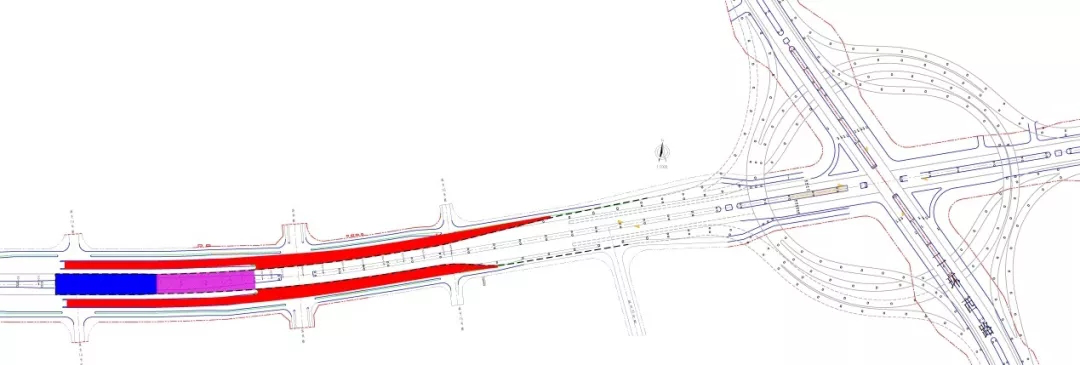 首先在立交橋兩側(cè)新建兩條上下橋匝道(圖中紅色部分),滿足施工期間車輛正常通行。第二步再進(jìn)行現(xiàn)狀引橋拆除(圖中藍(lán)色部分),最后進(jìn)行頂升施工(圖中玫紅色部分)。