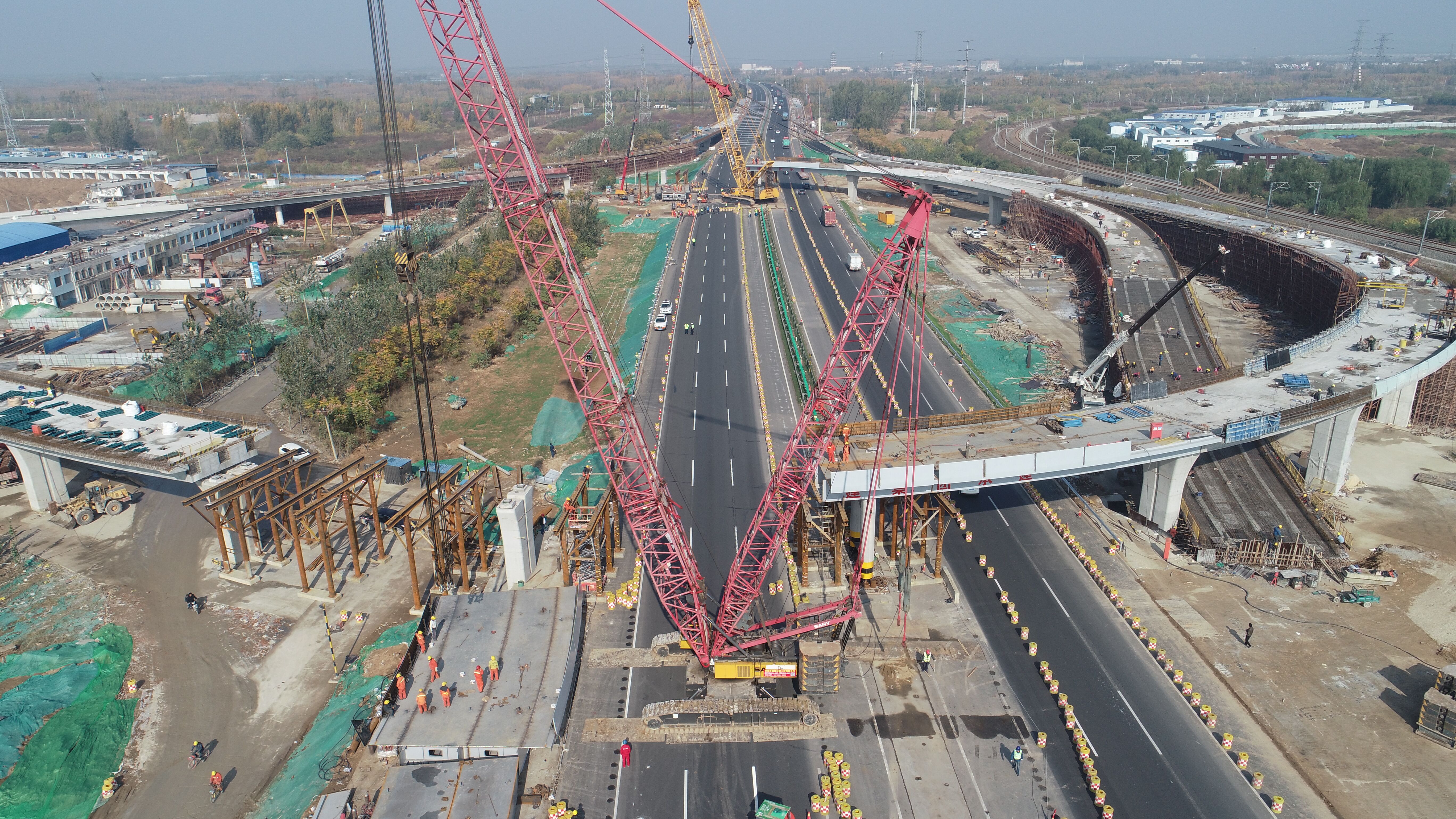 跨京臺高速鋼箱梁吊裝是整個工程極為關鍵的節點,吊裝段位于跨京臺高速的南北兩處匝道,分別長54米和60米,每段重達170余噸,起吊噸位大,施工過程需克服跨京臺高速、高空作業等不利因素,城建集團周密籌劃、科學組織,先后5次邀請行業內專家召開專項論證會,最終確定“單向封閉,兩匝道同時吊裝”方案,加大人、機、物投入,把整個作業時間由計劃5個半小時縮短至不到4小時,將高速通行影響降到最低,為工程節約了5天寶貴時間,為項目通車奠定堅實基礎。