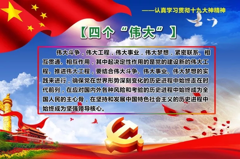 黨的十九大修改黨章明確把統攬“四個偉大”寫了進來,“四個偉大”指的是進行偉大斗爭、建設偉大工程、推進偉大事業、實現偉大夢想。