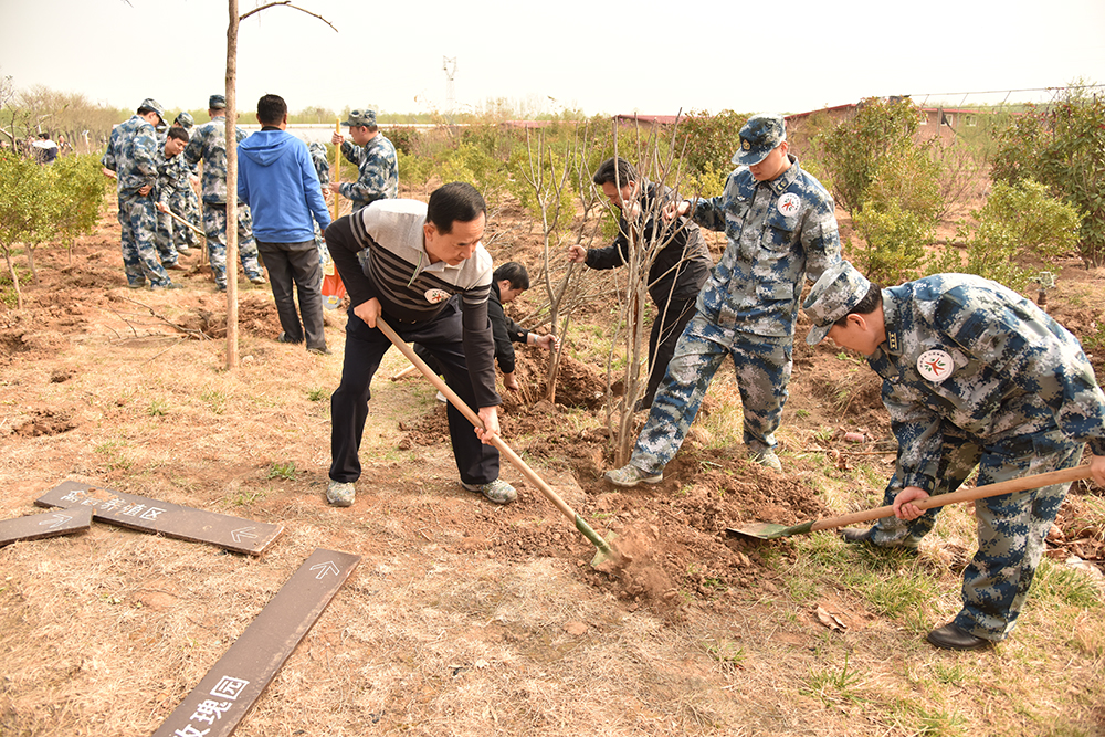 植樹現場大家繁忙有序、干勁十足,在技術人員專業指導下,一部分同志穿戴各自的工裝、迷彩服,揮舞著自己的隊旗,佩戴著“造綠濟南,志愿奉獻”的LOGO徽標,鏟土挖坑、扶苗栽樹;還有一部分同志對去年栽種的100多棵北美海棠樹進行培土、澆水、剪枝,并對周邊的垃圾進行拾撿清理為內容的“回頭看”勞動。在大家共同努力下,經過一個半小時的忙碌。共栽植近200余棵木槿樹。