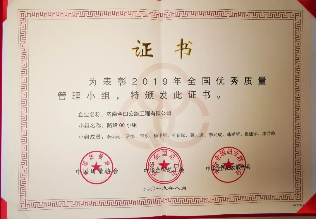 近日,在2019年全國交通質量年會上,濟南金曰公路工程有限公司再次獲得“全國優秀質量管理小組”稱號。這是金曰公司連續第九年獲得該榮譽稱號。