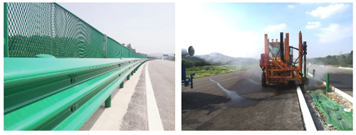 金宇公司在波形梁鋼護(hù)欄施工中,采用綠色環(huán)氧鋅基材料,以清潔能源生產(chǎn)替代傳統(tǒng)加熱方式,減少碳排放每噸護(hù)欄平均節(jié)煤100公斤,減排250公斤。在護(hù)欄立柱鉆孔施工中采取灑水降塵措施,嚴(yán)格做好環(huán)保工作。