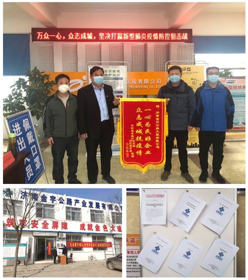 疫情來勢洶洶,在嚴(yán)峻條件下金曰公司、金宇公司等項目部主動出擊,儲備防疫物資,制作宣傳標(biāo)語,協(xié)調(diào)人員調(diào)度,一手抓防疫,一手抓復(fù)工,堅持“兩手抓”,奪取“雙勝利”。金曰公司項目部為沿線的8個村莊和濟(jì)菏高速收費(fèi)站捐獻(xiàn)了生活必需品、防疫物資,協(xié)助當(dāng)?shù)劓?zhèn)政府開展疫情防控工作,積極承擔(dān)社會責(zé)任。