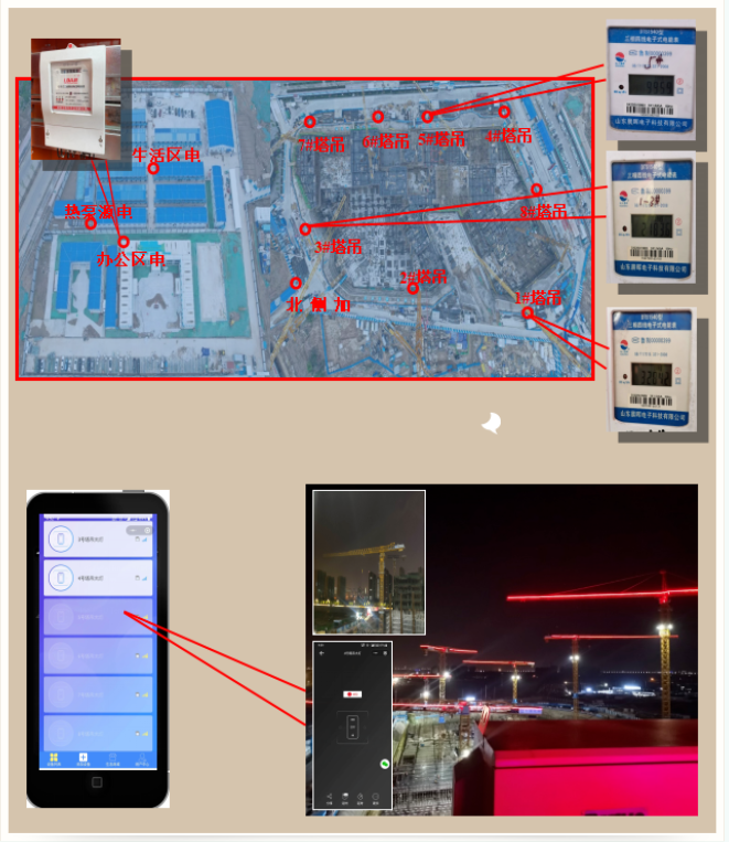 在房建類項(xiàng)目建設(shè)中,通過用電分區(qū)計(jì)量,將施工用電,辦公用電,生活用電均分開計(jì)量,現(xiàn)場8臺塔吊,均單獨(dú)計(jì)量,項(xiàng)目安排專人每月底抄表,做好用電臺賬,并統(tǒng)計(jì)分析,糾偏查因。同時(shí)通過項(xiàng)目部塔吊大燈遠(yuǎn)程智能控制系統(tǒng),保證施工現(xiàn)場無人施工時(shí)能第一時(shí)間利用APP使塔吊鏑燈,節(jié)約能源。