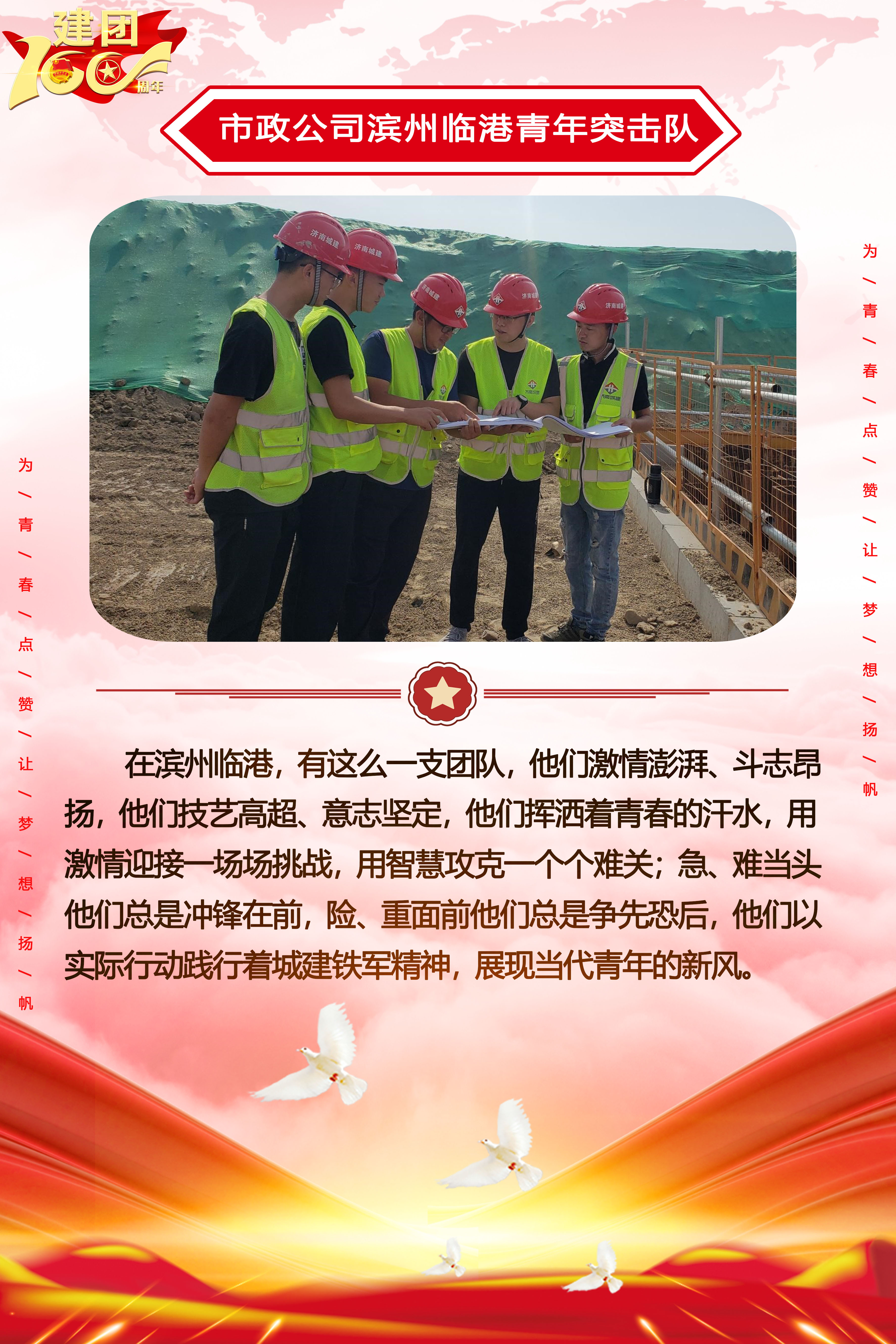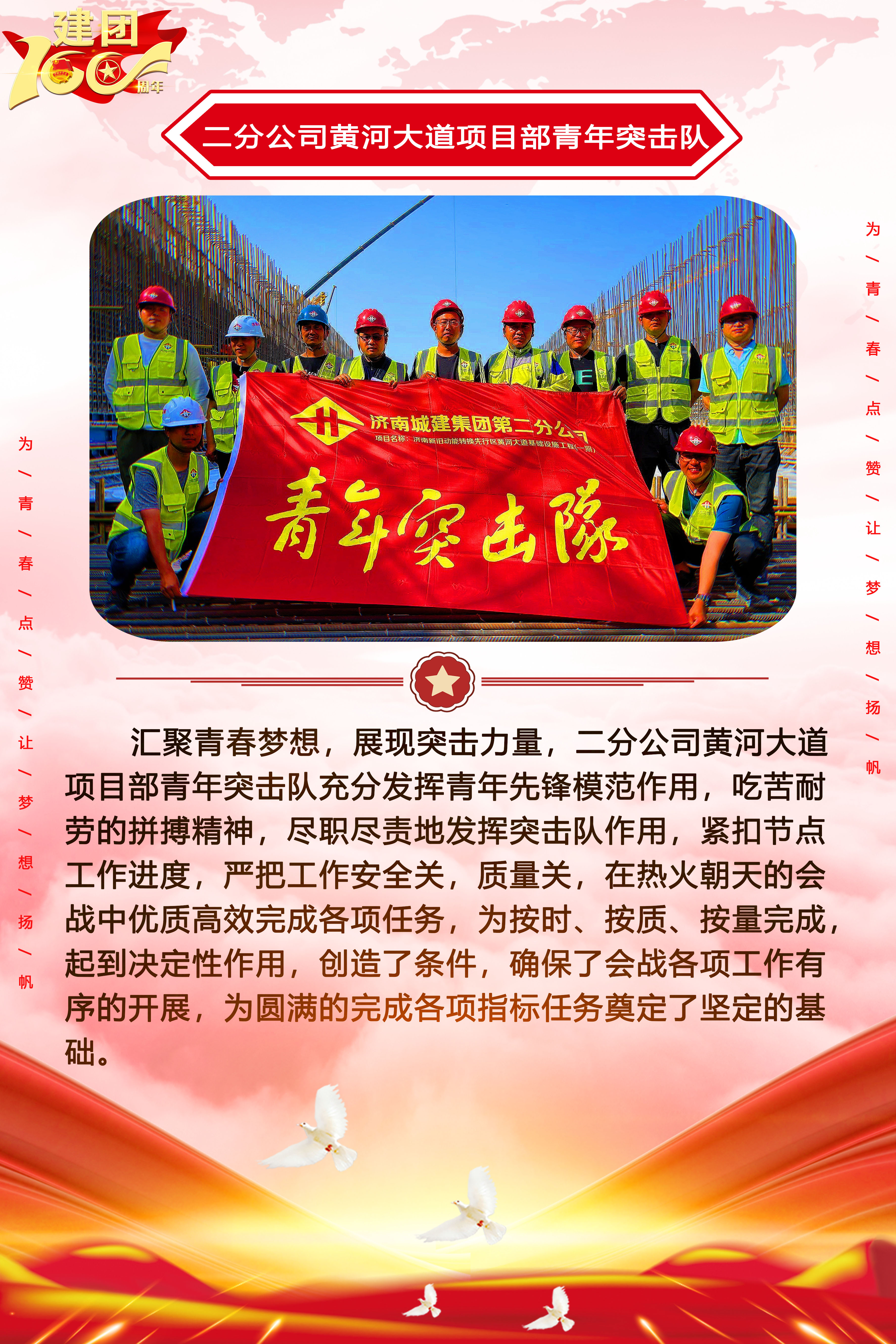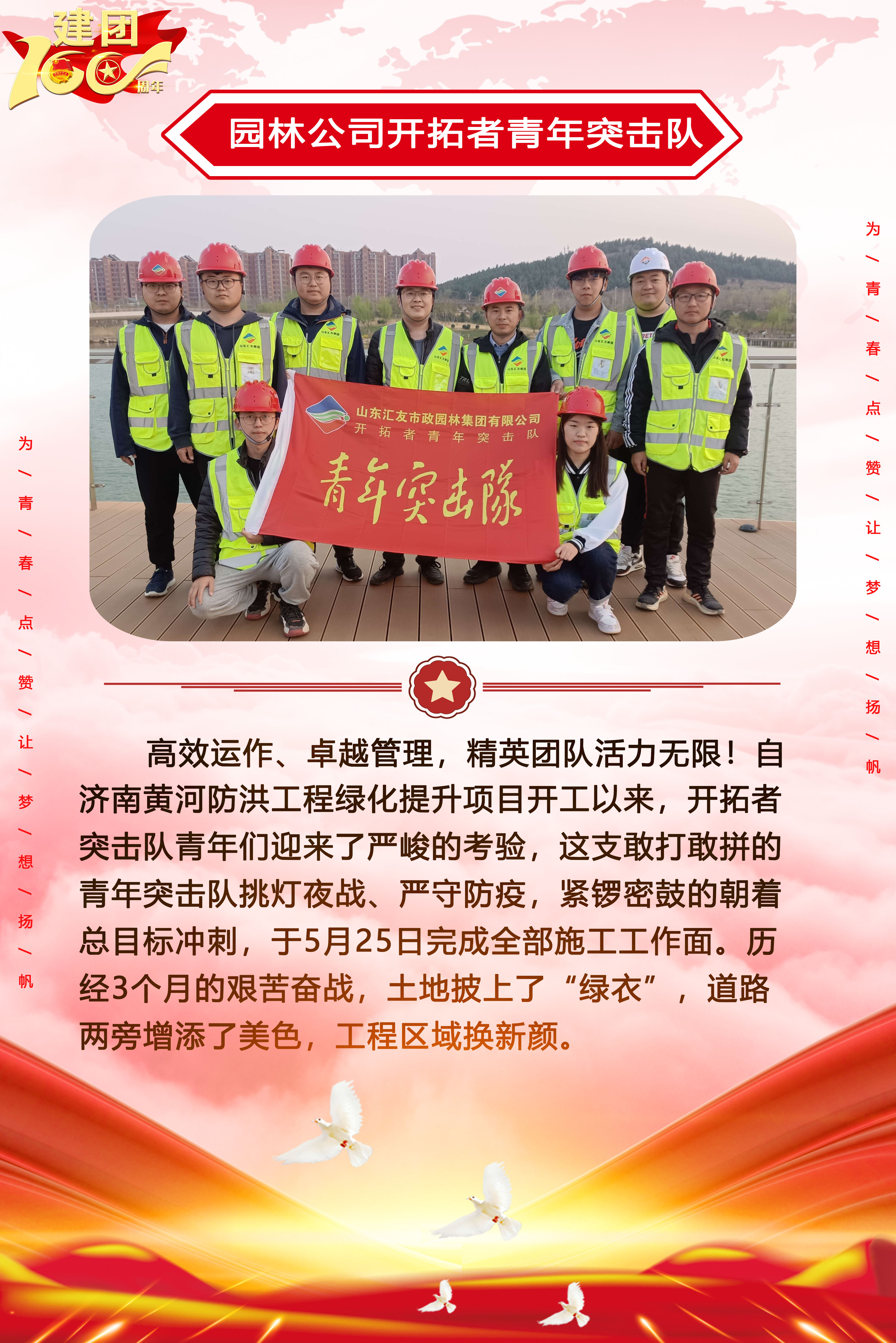 為慶祝中國共產主義青年團成立100周年,深情回顧共青團發展歷程,進一步增強廣大團員青年敬團、愛團意識,提升團組織的凝聚力和向心力,展示公司團員青年積極向上、奮發有為的精神風貌,集團第四團委——濟南城建集團有限公司團委持續開展團旗在城建飄揚合影活動。