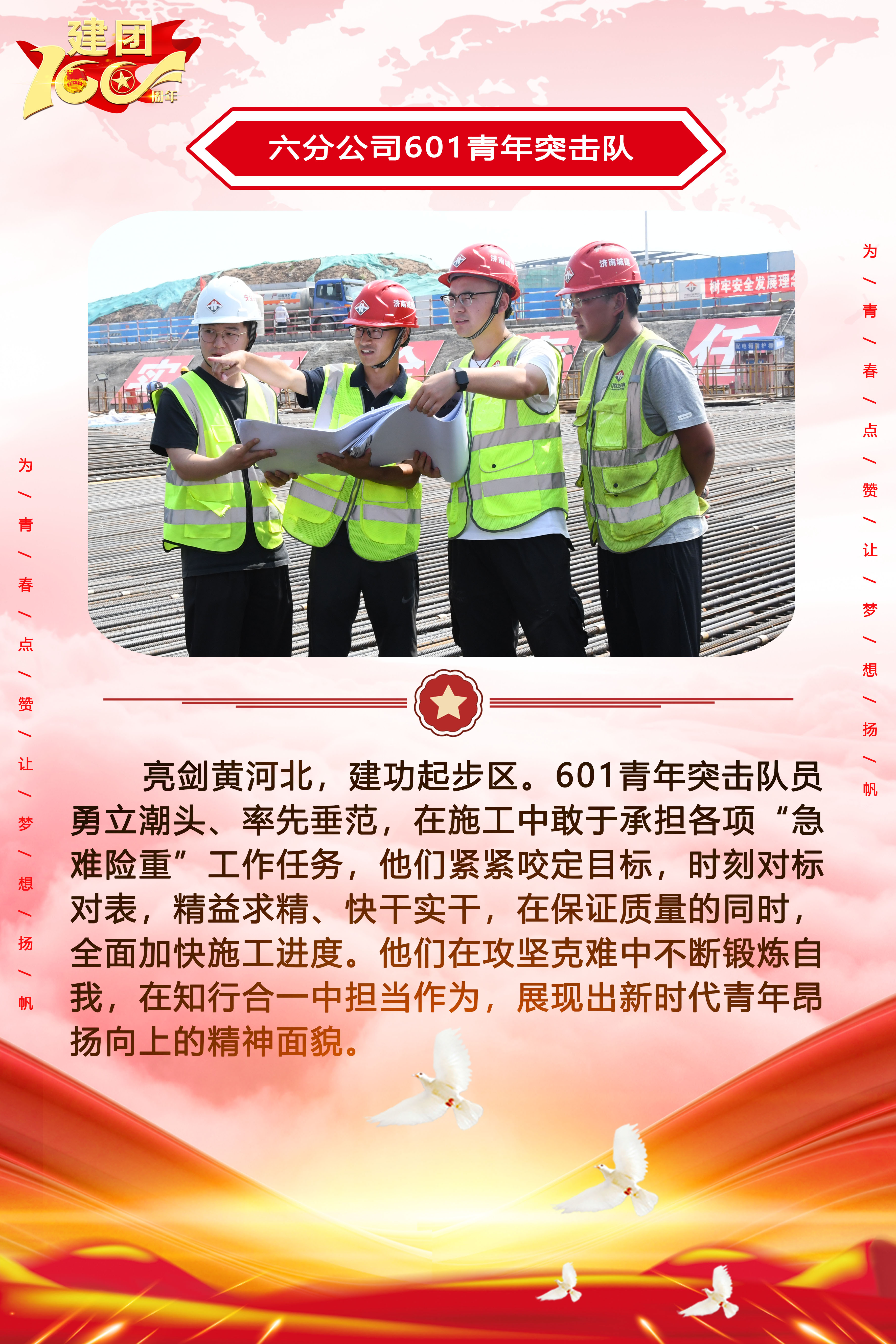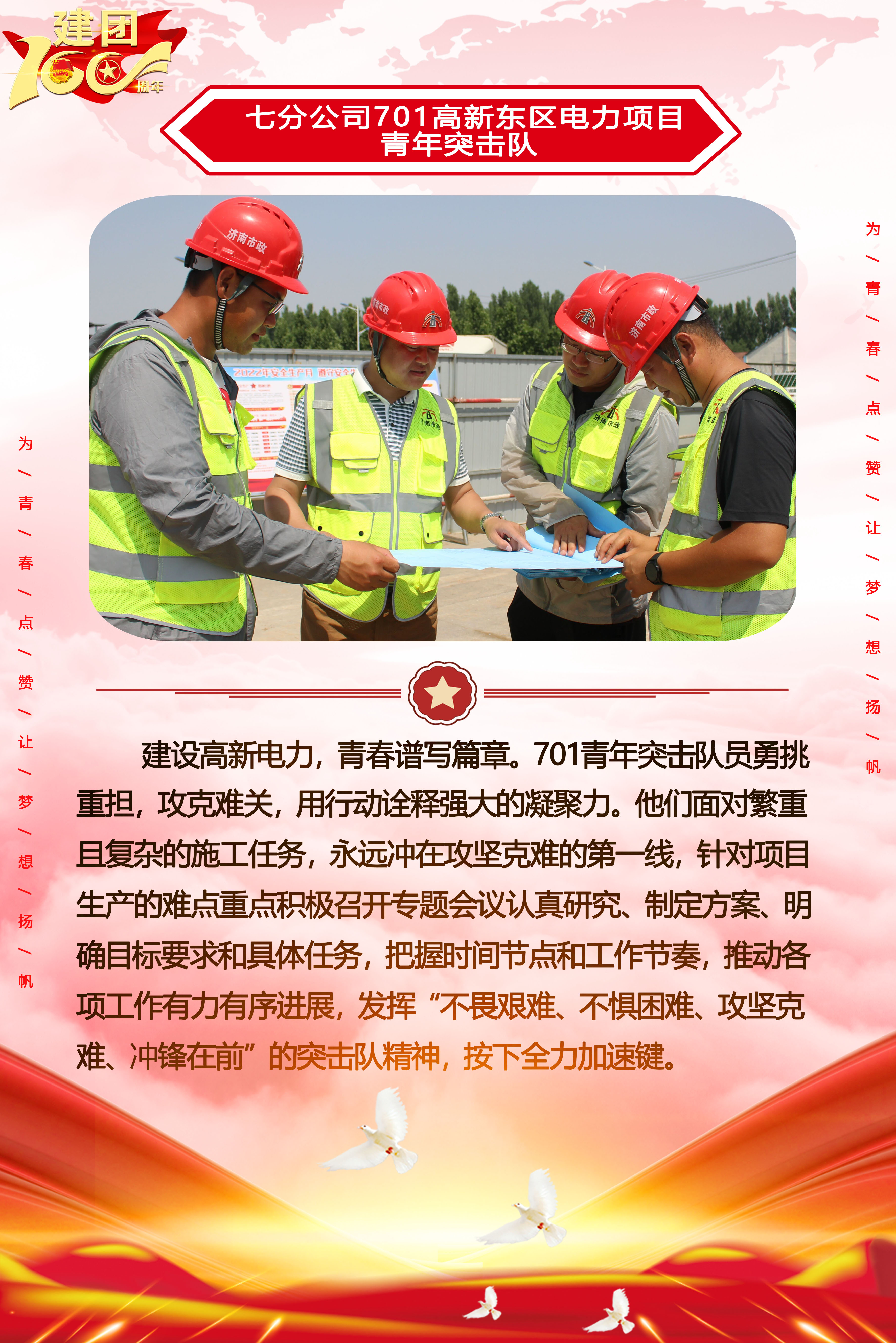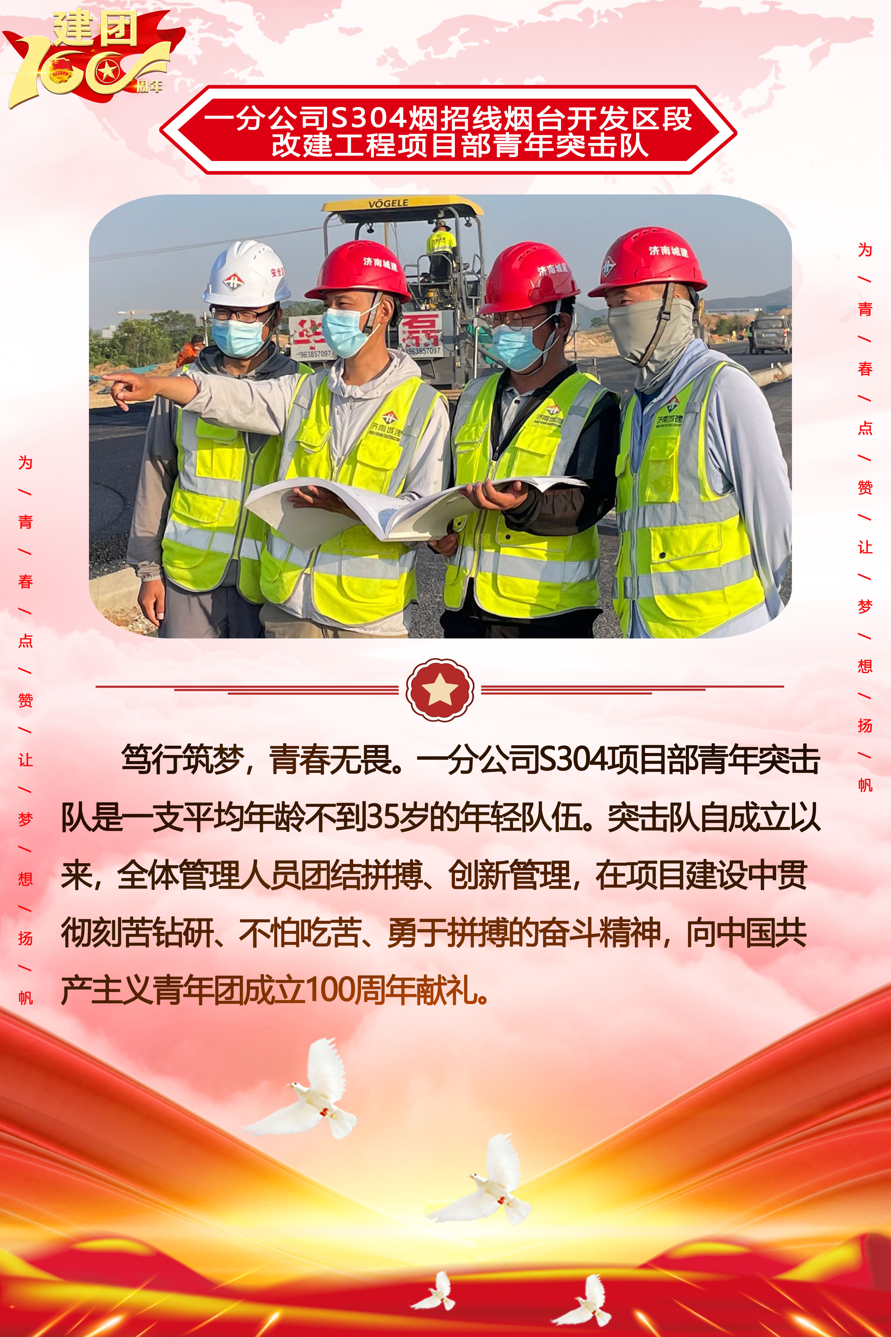 為慶祝中國共產主義青年團成立100周年,深情回顧共青團發展歷程,進一步增強廣大團員青年敬團、愛團意識,提升團組織的凝聚力和向心力,展示公司團員青年積極向上、奮發有為的精神風貌,集團第四團委——濟南城建集團有限公司團委持續開展團旗在城建飄揚合影活動。