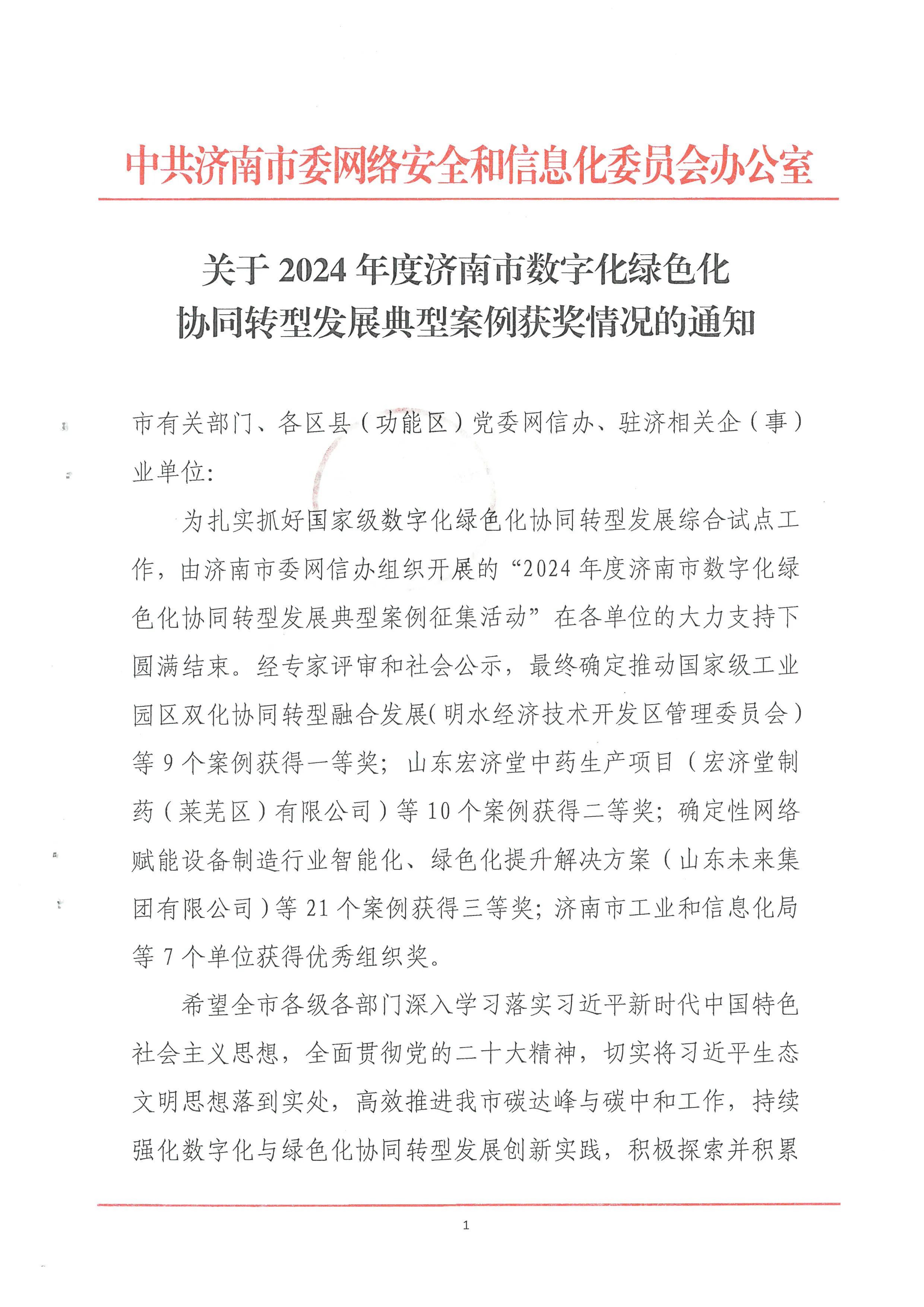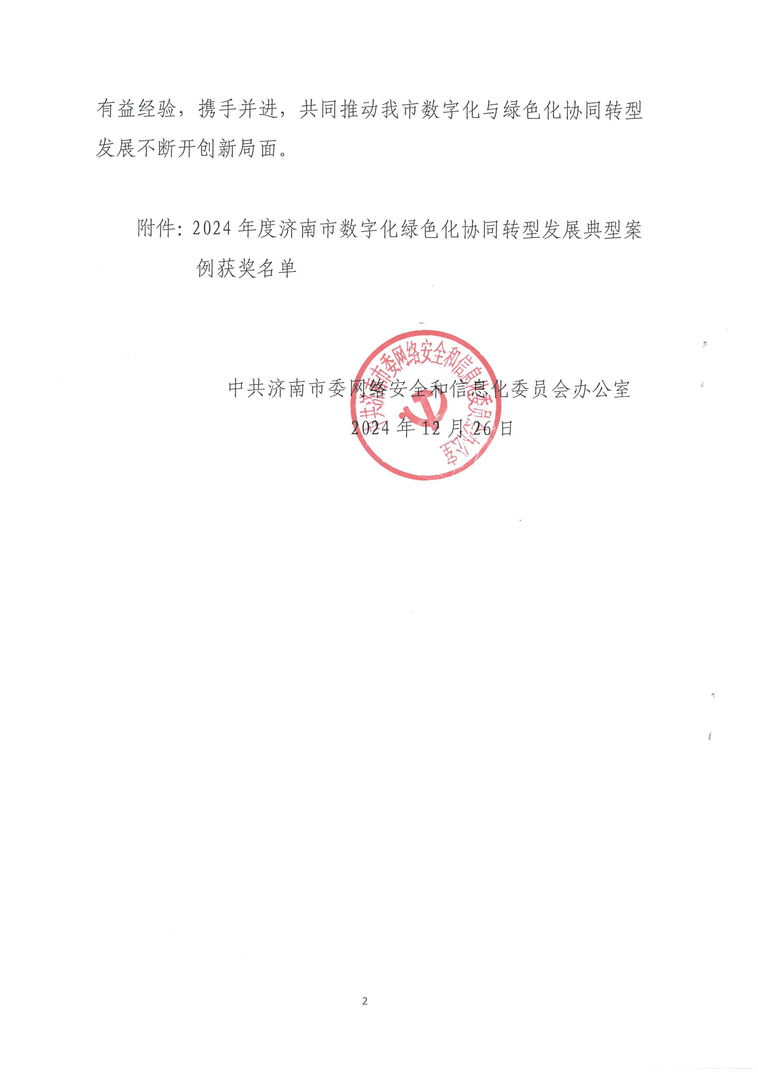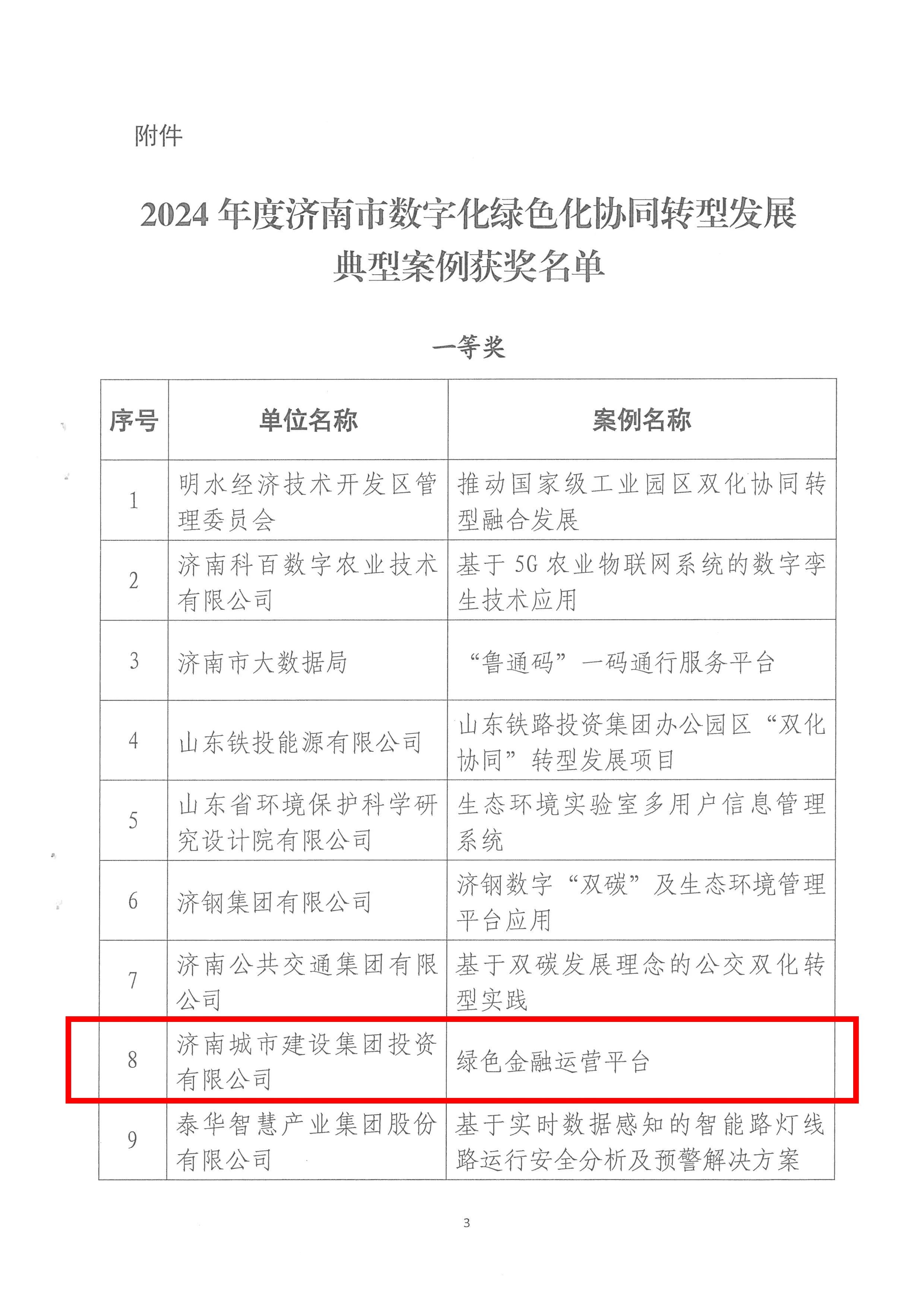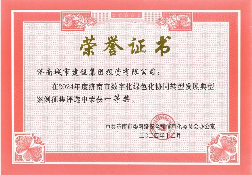 近日,濟南市委網信辦公布了《2024年度濟南市數字化綠色化協同轉型發展典型案例獲獎情況的通知》。經過嚴格的考察、評審與公示,建設集團所屬濟南城市建設集團投資有限公司提交的“綠色金融協同賦能平臺”案例在眾多參評項目中脫穎而出,榮獲一等獎。